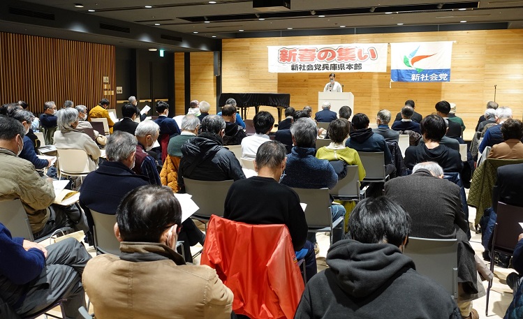 新社会党兵庫県本部(粟原富夫委員長)は2年つづけてコロナ禍のために開催を見合わせていた「新春の集い(新春講演会)」を1月17日、中央区文化センターで3年ぶりに開いた。集いでは水摩雪絵さん(東京・葛飾区議、新社会党東京都本部書記長。写真・下)による「区議選のネットワークづくり―どう選挙をたたかったか」と題した講演に学ぶとともに、そろって出席した統一自治体選挙をたたかう兵庫県本部公認、推薦、支持の予定候補者全員の勝利に向けた決意を共有し合った(写真・中)。