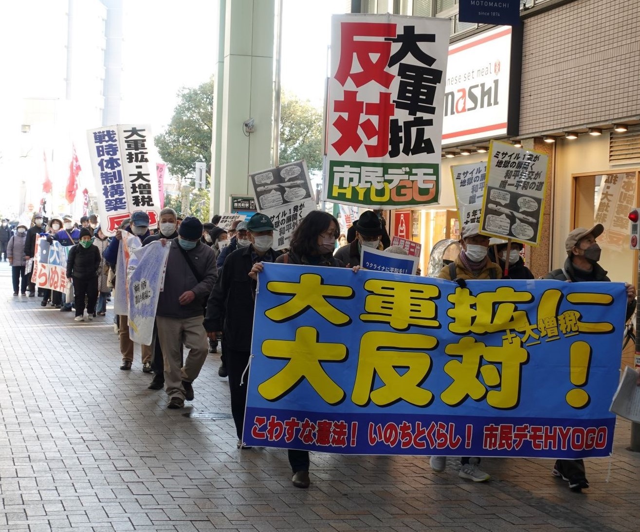 岸田政権が「防衛力の抜本的強化」の名のもとに昨年12月、国会審議も経ることなく閣議決定した「安保関連3文書」。敵基地攻撃能力の保有を含め、軍事費の大幅増額(5年間で43兆円)などを盛り込み、戦後の安保政策の大転換を図るもので、日本が再び「戦争国家」への道を踏み出そうとするものだ。この動きを許さず、大軍拡反対の声をあげようと、40を超える市民団体でつくる「市民デモHYOGO」は2月23日、神戸市中央区の市立婦人会館で「ストップ大軍拡!市民集会&デモinHYOGO」を開き、250人が参加した。
