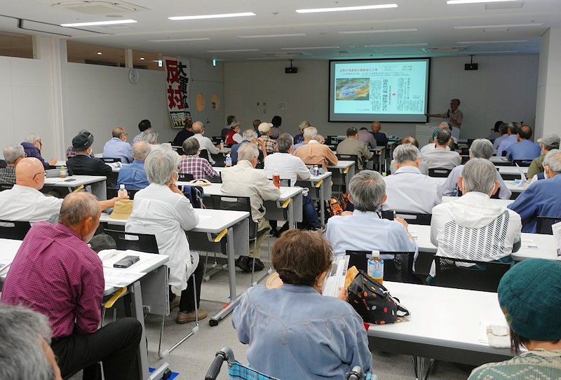 午前10時から開かれた講演会には約70人が参加。辺野古の軟弱地盤問題を初めて提起した土木建築家の北上田毅さんが「辺野古から見た沖縄の軍事要塞化」と題して講演した。北上田さんは辺野古新基地建設の現状について、辺野古側の埋め立ては92%まで進んでいるものの大浦湾側はいっさい土地投入ができず進捗率は全体で14%(今年3月末現在)だと報告するとともに、この新基地建設は必ず頓挫するしかないことを、深刻な軟弱地盤の問題、再度の設計変更申請が必要となること、建設・補修にかかる莫大な費用と時間、さらには大地震・大津波の危険性など、その根拠を多面的、かつ具体的に説明しながら力説した。