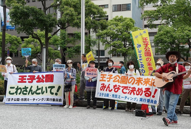 「王子公園こわさんといて」 市民が抗議集会とデモ 6.1 神戸市役所前 関学は応募の取り下げを |