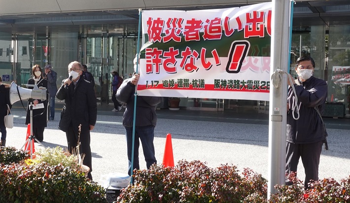 【阪神・淡路大震災から28年】 神戸市役所前でスタンディング 旧「集い実行委員会」の有志ら |