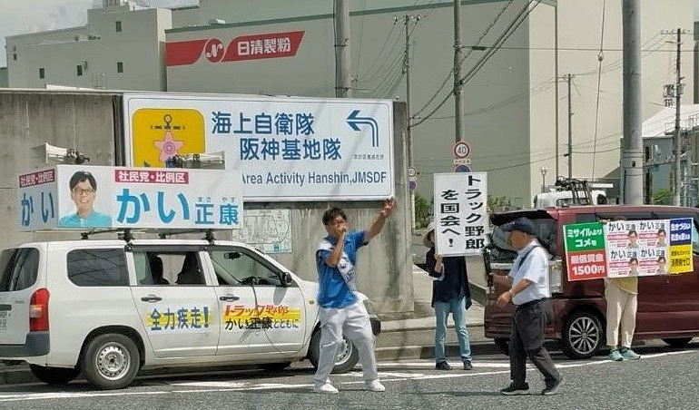 ●かい正康さん来神東灘区のトラックヤードで街宣=7月11日