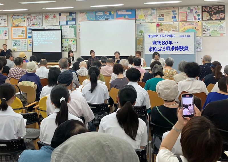 フェスタでは、23日には「戦争体験談の集い.戦後80年…市民による戦争体験談」が開かれ、矢野蓉子さんの明石空襲を体験したお話や、中国残留婦人2世の安江静子さんの、日中戦争で残留難民となって苦労した母親のお話を聞いた。集いには高校生平和大使の参加もあり、「高校生が平和について伝えたいこと」の発言もあった。