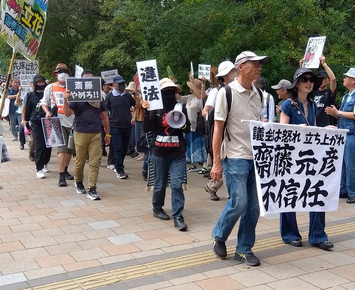 この日、約100人の参加者は「斎藤知事に辞職を求めます」「9月県議会で斎藤知事不信任を決議してください!」などの横断幕やプラカードをかかげ、スピーチ、歌、コールなどを通して県職員や県会議員、通行者に訴えた。
