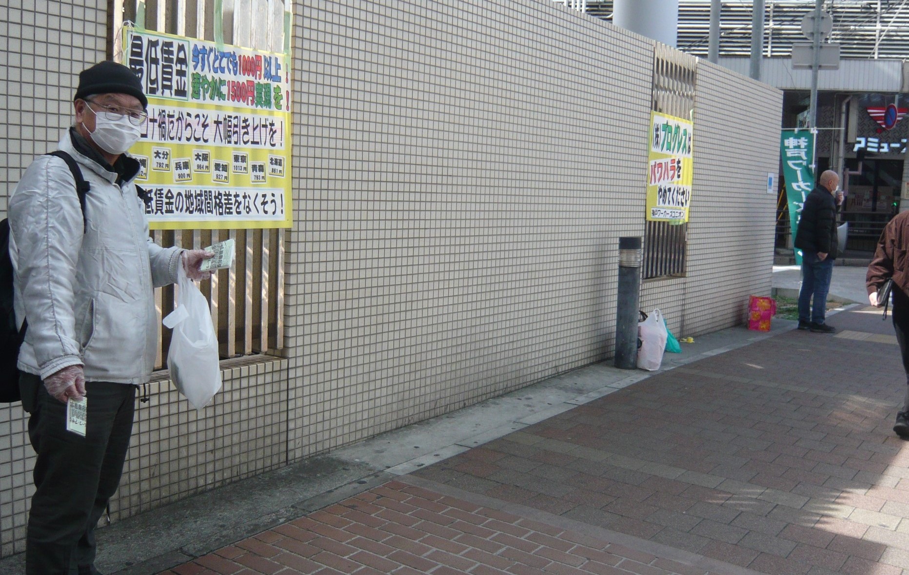 この間、姫路では2019年秋にコミュニティ・ユニオン全国交流集会を受け入れ、その後も2020パートアクション、はりまパート集会(20年12月12日)など力を合わせて行動を重ねてきた。この日は非常に風が強く、気温も低い中での行動となったが、「コロナ禍で非正規労働者の雇用・労働条件が犠牲になっている」「最賃引上げが労働者全体の賃上げにつながる」と市民に語りかけて、用意したポケットティッシュ150個、チラシ60枚を配付した。(森口、上野、金平、細川)