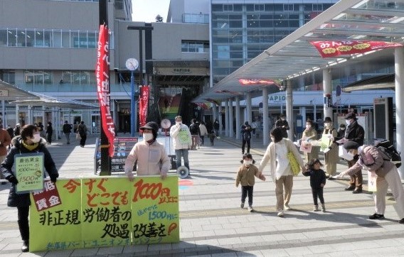 尼崎ではJR尼崎駅前で、最賃引き上げと合わせて「必要のない有期雇用をなくし、無期雇用をめざそう!非正規雇用差別をなくそう!」をスローガンに掲げたパートアクションを全国同時アクションの一環として取り組み、武庫川ユニオン、ユニオンあしや、自治労臨職部会から20人が参加した。横断幕やコンパネなどを目立つように工夫し、「コロナ禍だからこそ、最低賃金の引き上げを!」「コロナ禍だからこそ、非正規雇用の差別をなくせ!」などと順番にマイクで訴えた。寒くて風も強い中、チラシ、ティッシュを200個(枚)を配布した。