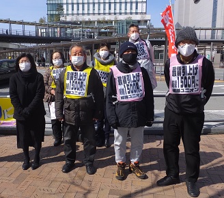 風が冷たい中、JR尼崎駅前での行動を終えた仲間たち=2月27日