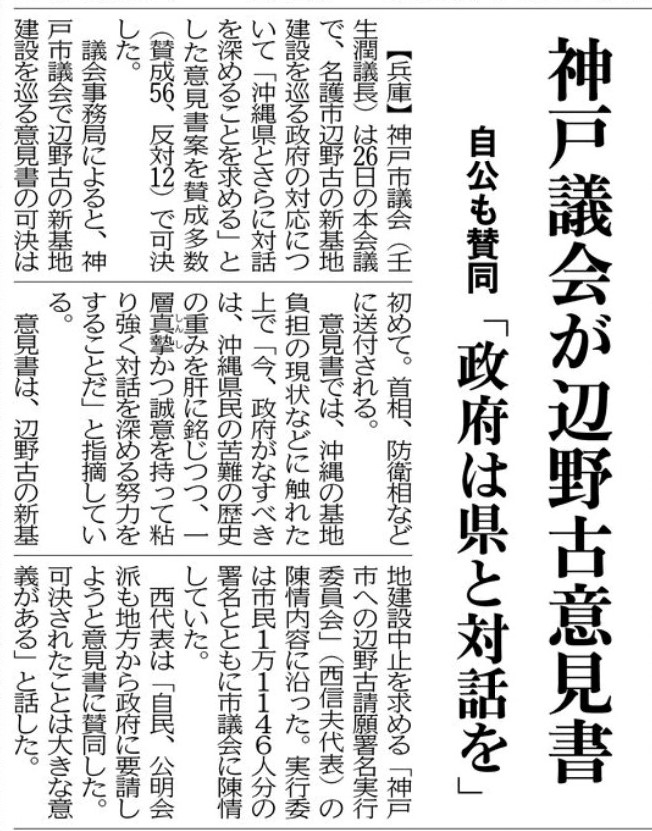 3月26日に開かれた神戸市会本会議で、政府に対して「辺野古基地建設について沖縄県と更に対話を深めることを求める意見書」が、賛成多数(賛成56、反対12)で採択された。